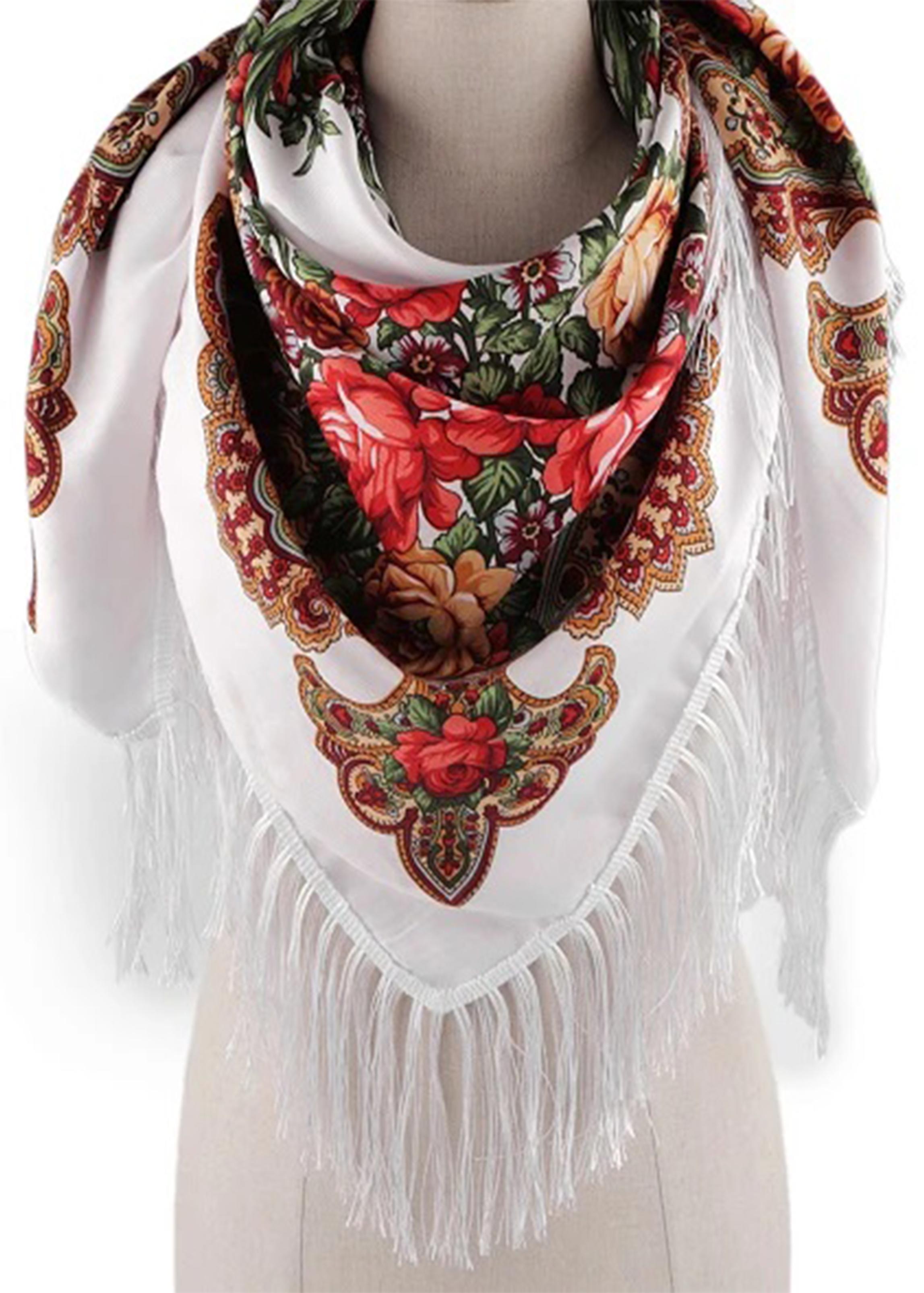Folklórna šatka s kvetinami a strapcami – biela