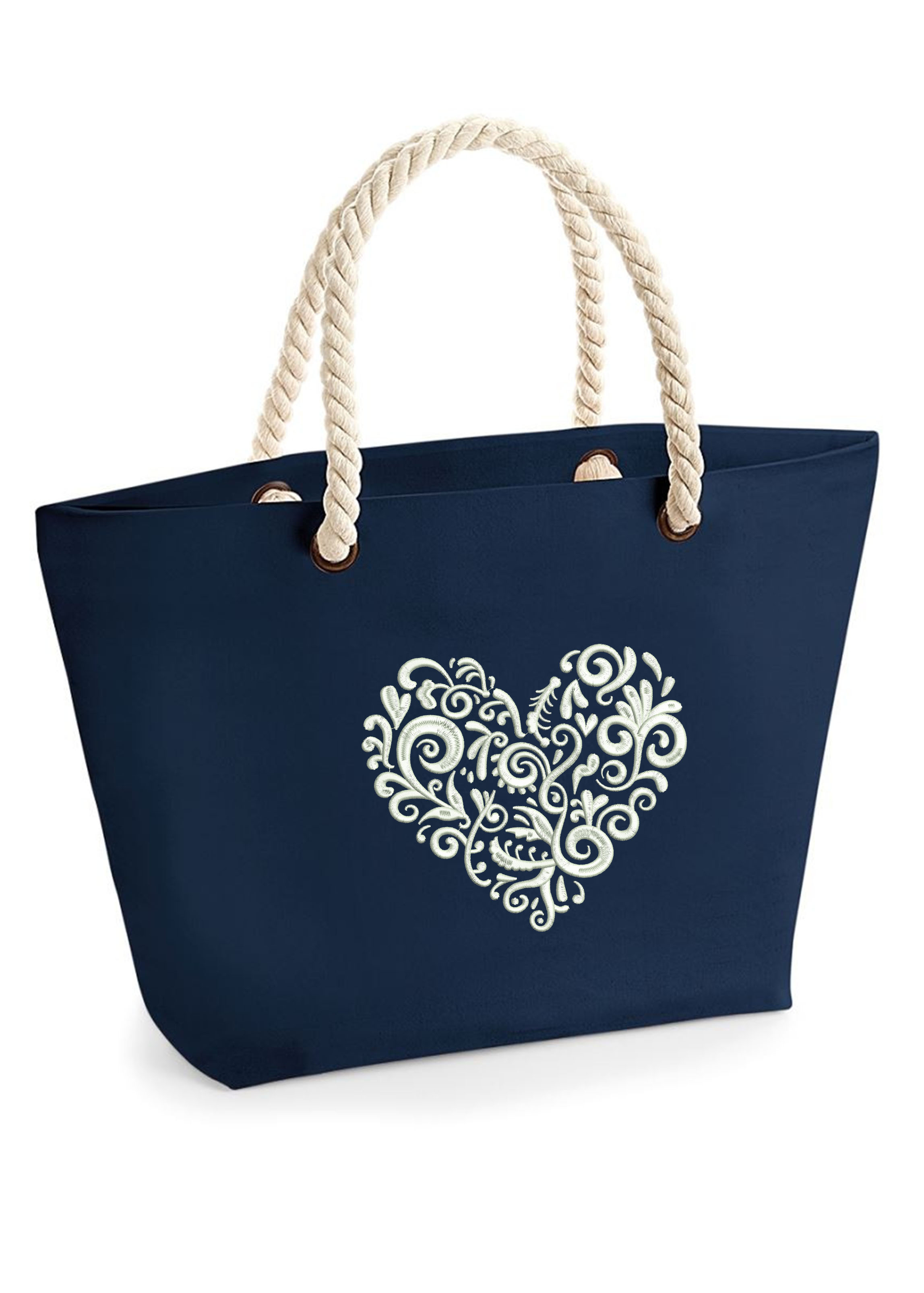 Unikátna plážová taška s nádhernou bielou výšivkou v ľudovom štýle! Taška je v námornícko-modrej farbe. Je z kvalitného bavlneného plátna o hrúbke 407g/m2.